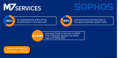 The increasing prevalence and sophistication of ransomware attacks demand our attention and proactive measures. By attending "The State of Ransomware in 2023" webinar, you'll gain crucial insights into the evolving threat landscape and discover effective strategies to protect yourself, your organization, and your valuable digital assets. Join M7 Services and Sophos on August 31, 2023, at 3:00 pm CST to enhance your cybersecurity knowledge and fortify your defenses against this ever-present danger.